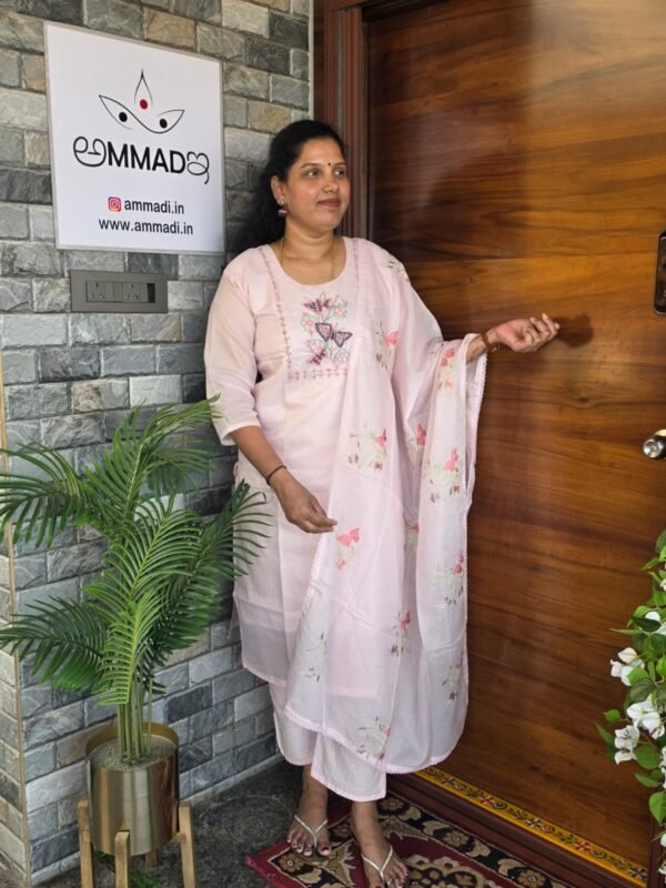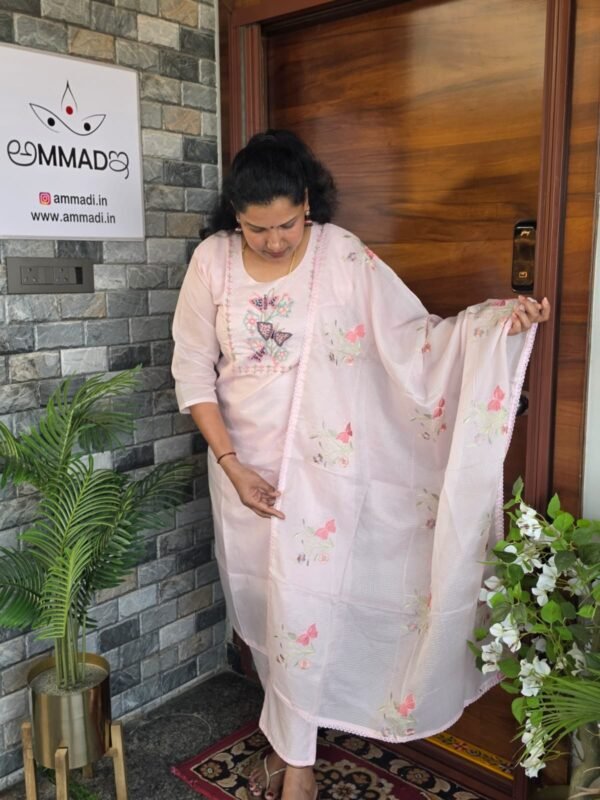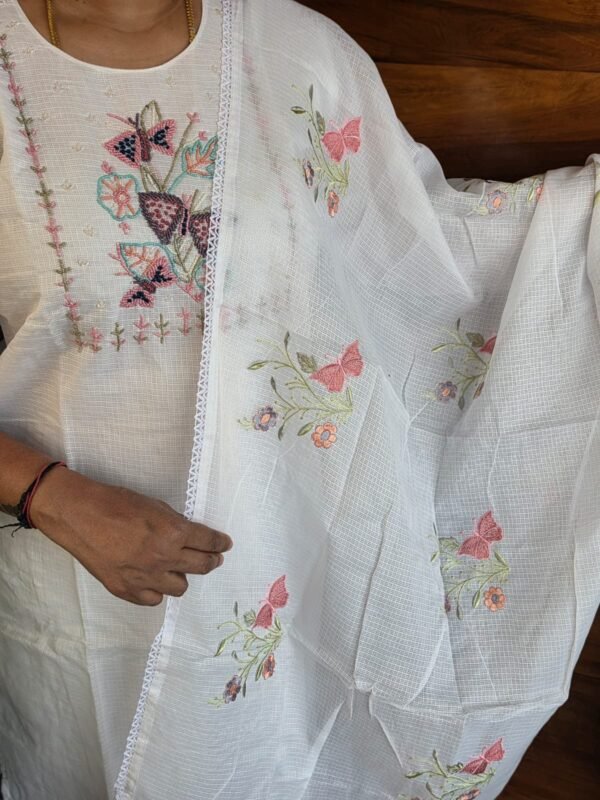 Elevate your ethnic wardrobe with this ethereal Salwar Suite set, featuring intricate butterfly-themed embroidery and a breezy, textured finish.